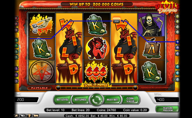 Der Slot Devils Delight wird auf 5 Walzen gespielt. Er wurde von Netent entwickelt, was schon ein Garant für ein gutes Spiel ist. Wie der Name schon sagt handelt es sich um ein teuflisch humorvolles Spiel. Gruselige Symbole machen in diesem Spiel sehr viel Spaß. Wild, Scatter und Bonus Symbole sind reichlich vorhanden und versprechen reichlich Gewinne, die das Konto füllen. Dieser Slot verfügt nicht nur über eine perfekte Grafik, sondern auch um ein Sonderspiel, dass sicher die Spannung noch weiter erhöht. Dieses Spiel ist besonders für die Liebhaber des schwarzen Humors geeignet. Der Teufel ist auf Seelenfang und seine teuerste Gehilfin ist Frau Teufel, die, sollte Sie 5 Mal auf den Walzen und in einer der 20 Gewinnlinien erscheinen, bis zu 4000 Münzen einbringt.